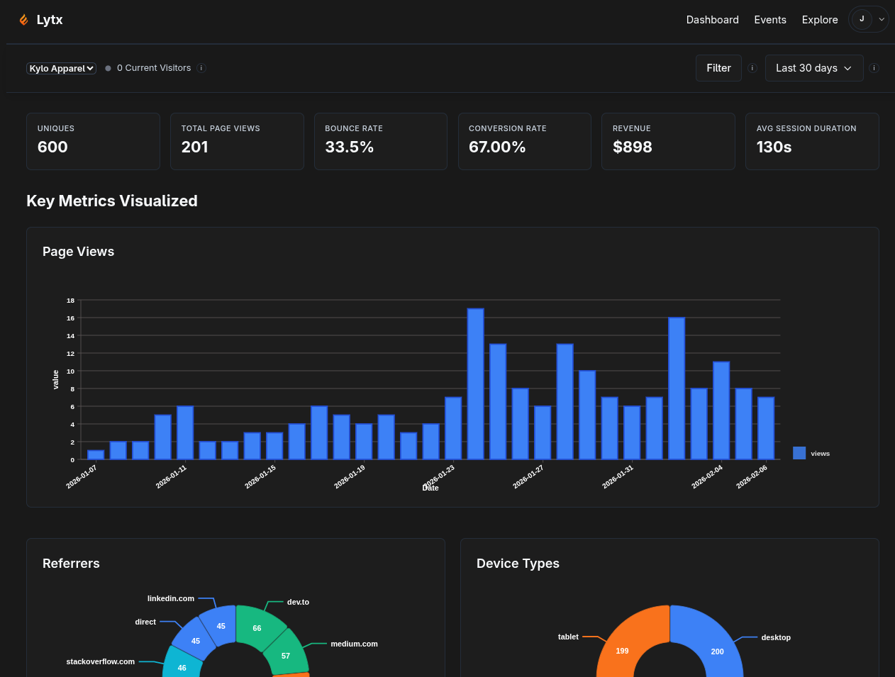 <script defer data-domain="yoursite.com" src="https://lytx.app/script.js"></script>Yes, fully. We don't use cookies and we don't collect any personal data. You don't even need a cookie banner.